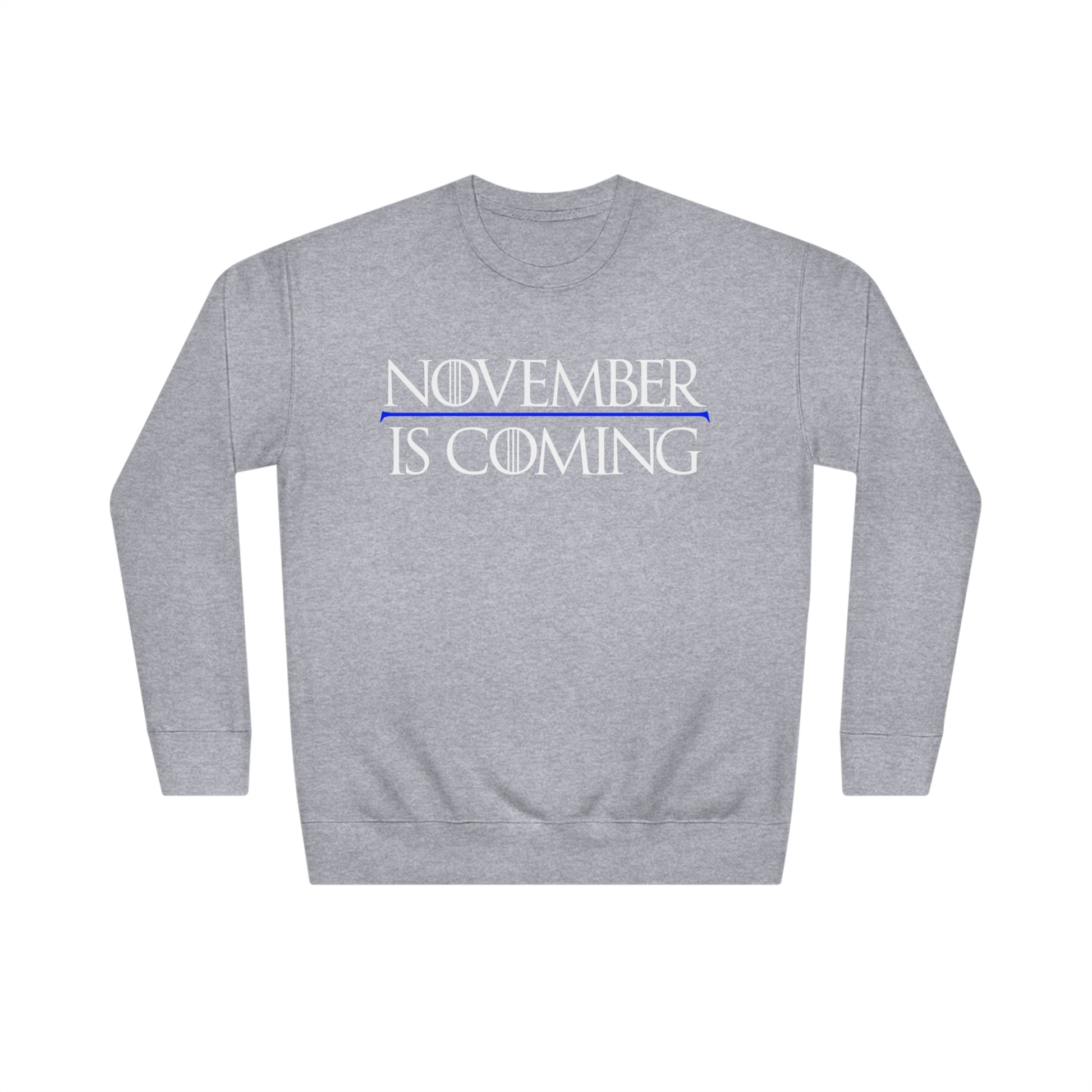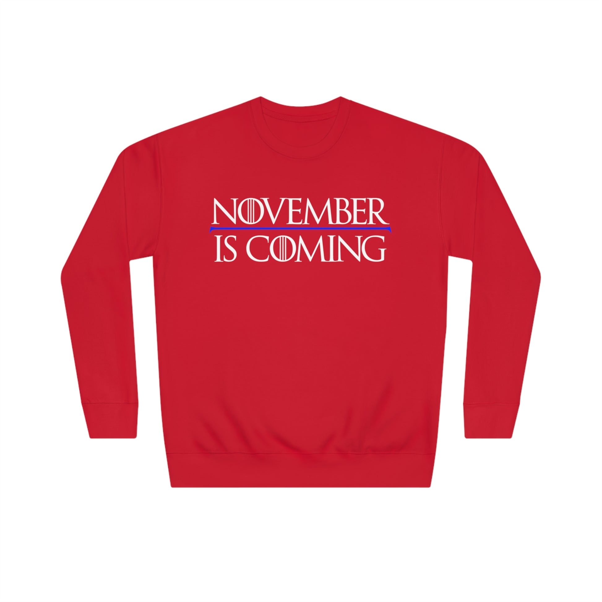 Whether you're out campaigning, attending fall festivities, or simply relaxing at home, the "November Is Coming" sweatshirt is a perfect addition to your wardrobe. It's more than just a piece of clothing; it's a statement that keeps you warm and stylish throughout the season.